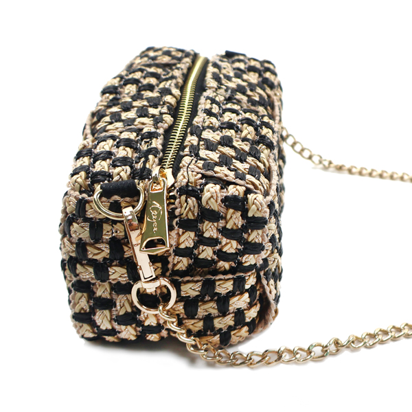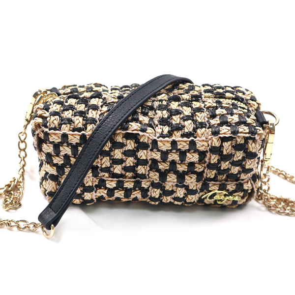 Cuboid shaped woven crossbody bag.
