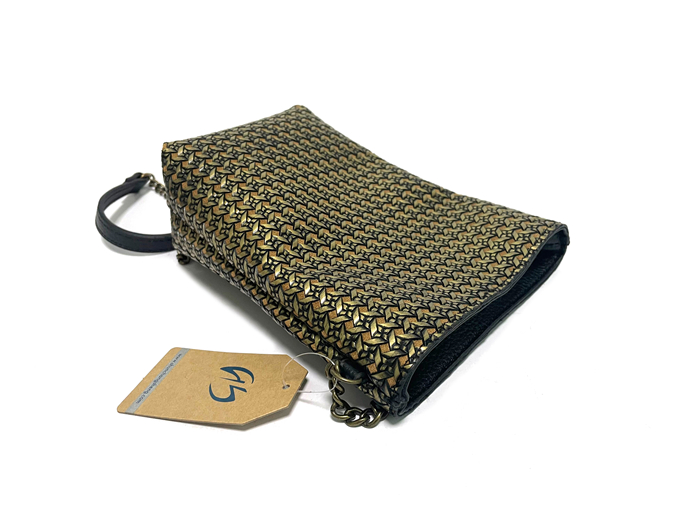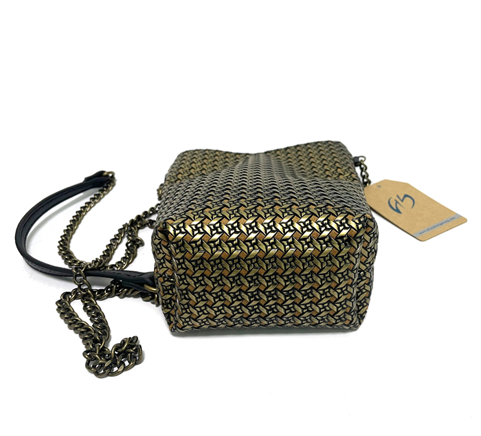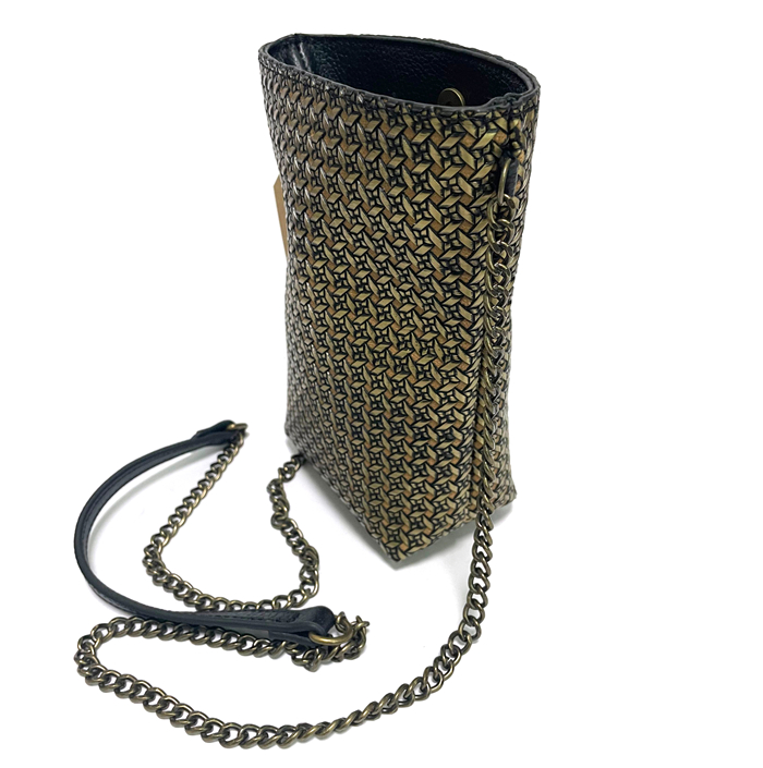 A crossbody bag made of vintage metallic embossed leather. Small items like your phone and keys can fit inside.