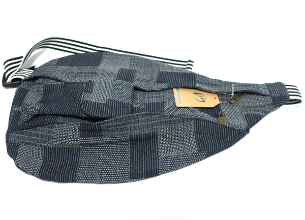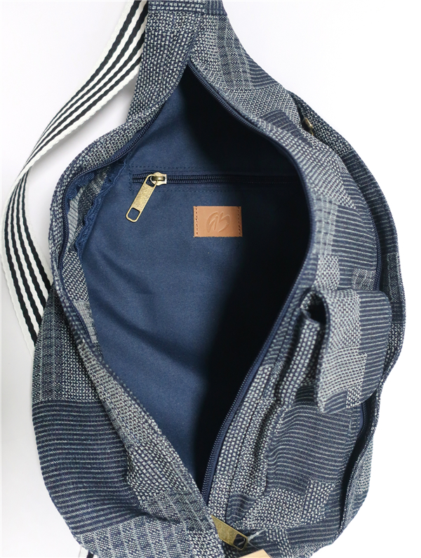Woven denim canvas sling backpack.