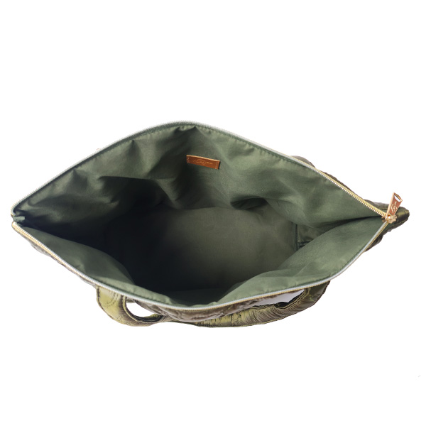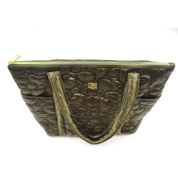 Metallic quilted fabric tote with top zipper closure.