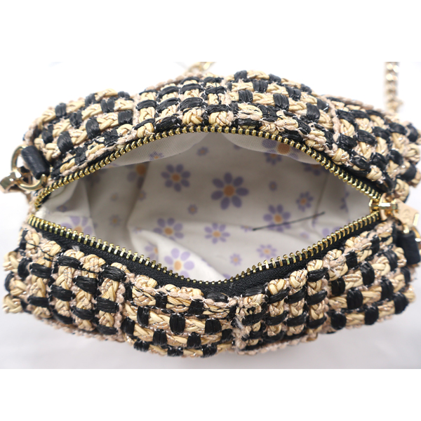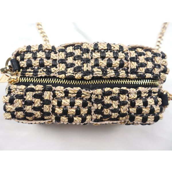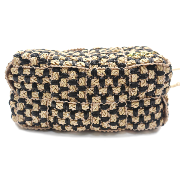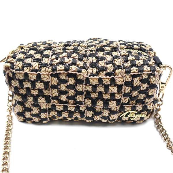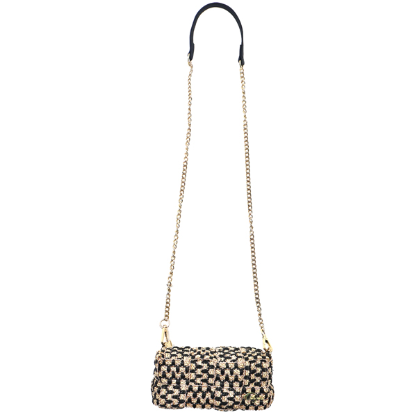 Cuboid shaped woven crossbody bag.