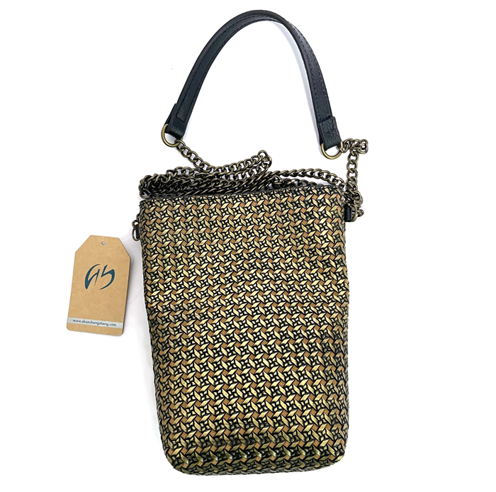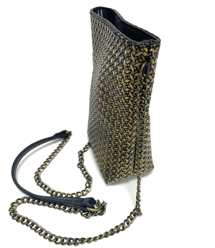 A crossbody bag made of vintage metallic embossed leather. Small items like your phone and keys can fit inside.