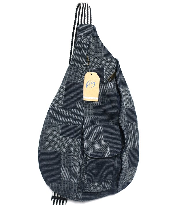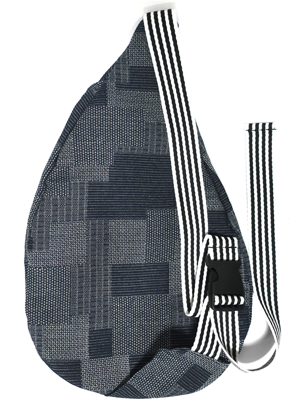 Woven denim canvas sling backpack.